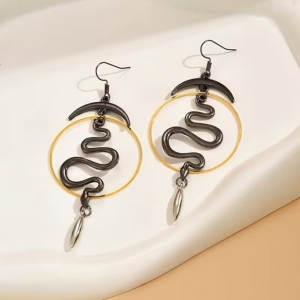 🌙 Vintage Boho Kõrvarõngad – tumehõbedane kuu ja madu kuldses rõngas