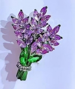 See imekaunis pross on kui miniatuurne lillekimp, mis on jäädvustatud säravate kristallide keeles. Lillakates toonides marquise‑lõikelised kivikesed moodustavad õrnad kroonlehed, mida täiendavad rohelised varred ja lehed. Kogu kompositsiooni seob kokku sädelev kristallriba, mis meenutab elegantselt seotud lillekimpu. Tulemuseks on ehe, mis on samaaegselt romantiline, luksuslik ja pilkupüüdev.